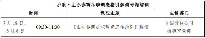 6月20日,全国股转公司正式发布《全国中小企业股份转让系统主办券商尽职调查工作指引》,为及时向相关市场主体传递规则要求,拟于7-8月举办两期主办券商培训,深入解读规则修订背景及具体内容。培训安排如下: