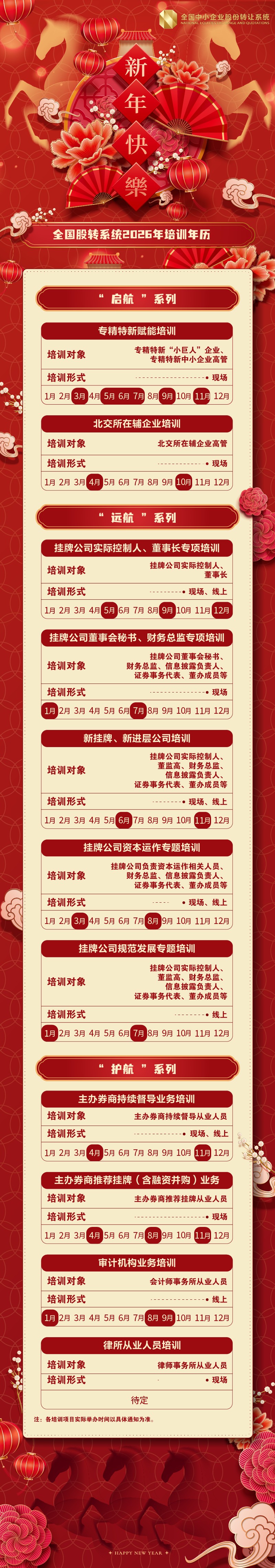 2026年,全国股转公司拟面向挂牌后备企业、挂牌公司、证券服务机构等市场主体,线上线下结合举办多场“航”系列培训活动,现发布“2026年培训年历”,欢迎各市场主体积极参与。各项培训实际举办时间以具体通知为准,全国股转公司将及时在官网官微、培训服务平台(https://edu.neeq.com.cn/)发布通知,敬请持续关注。