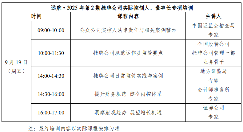 为加强对挂牌公司实际控制人、董事长财务规范意识的引导,帮助其提升诚信意识、合规意识,促进挂牌公司高质量发展,全国股转公司拟于9月19日在郑州以“求真求实 树诚树信”为主题举办远航·2025年第2期挂牌公司实际控制人、董事长专项培训。具体安排如下: