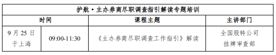 为帮助主办券商相关从业人员系统了解《全国中小企业股份转让系统主办券商尽职调查工作指引》的主要内容,全国股转公司拟于9月25日在上海举办指引解读专题培训,深入介绍指引修订的背景、思路及具体要求。培训安排如下: