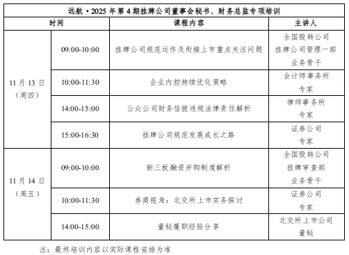 为强化挂牌公司董事会秘书、财务总监合规意识,帮助其更好掌握监管要求,提升执业水平,全国股转公司拟于11月13日-14日在石家庄以“求真求实 树诚树信”为主题举办远航·2025年第4期挂牌公司董事会秘书、财务总监专项培训。具体安排如下: