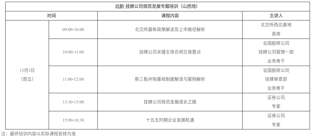 为进一步强化挂牌公司高级管理人员的规范意识,推动完善公司治理,促进挂牌公司高质量发展,全国股转公司拟于12月5日在太原举办远航·挂牌公司规范发展专题培训(山西场)。具体安排如下: