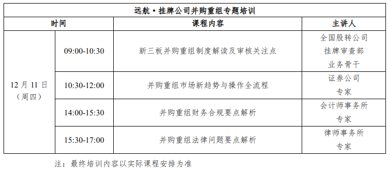 为深入贯彻新“国九条”要求,进一步活跃并购重组市场,帮助挂牌公司借助并购重组工具实现高质量发展,全国股转公司拟于12月11日在杭州举办远航·挂牌公司并购重组专题培训。具体安排如下: