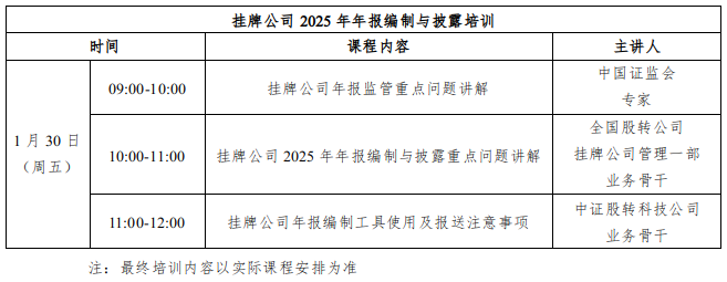 为保障挂牌公司顺利开展2025年年报编制与披露工作,提高年报信息披露质量,全国股转公司拟于1月30日在线举办挂牌公司2025年年报编制与披露培训。培训具体安排如下: